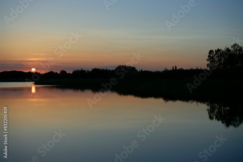 A serene sunset scene over a calm lake with reflections of the diminishing sun and silhouetted landscape against a gradient evening sky.