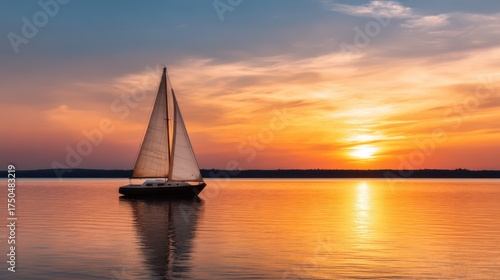 A serene sunset view featuring a sailboat on calm waters, reflecting vibrant colors of orange and yellow in the sky.