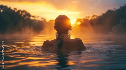 A serene sunset view of a person in water, surrounded by mist and nature.