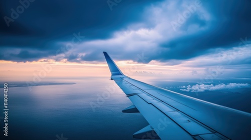 A serene view from an airplane wing, showcasing a dramatic sky and tranquil ocean beneath, evoking a sense of adventure and exploration.