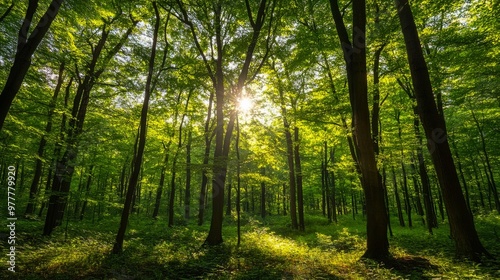 A serene view of a lush green forest with sunbeams piercing through the tall trees, creating a tranquil and refreshing atmosphere.