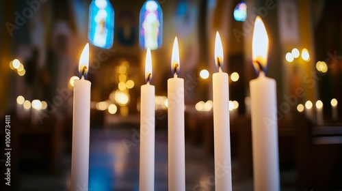 A serene view of flickering candles in a dimly lit church, creating a peaceful atmosphere during a reflective moment in the evening