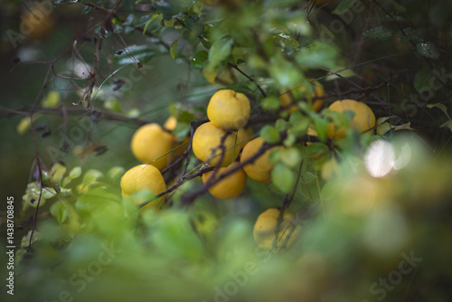 A serene view of ripe quince fruits hanging gracefully from a tree branch, blurred background.