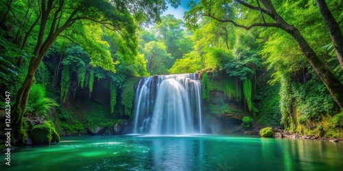 A serene waterfall cascading into a tranquil pool amidst lush green foliage and towering trees with leafy canopies overhead, water feature, nature scene