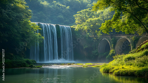 A serene waterfall cascading into a tranquil river surrounded by lush greenery.