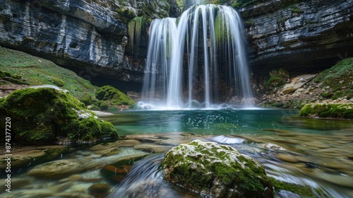 A serene waterfall in a hidden glade, with moss-covered rocks and clear, cool water flowing into a pool below.