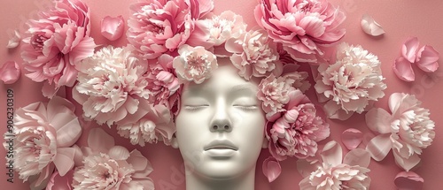A serene white head sculpture adorned with pink and cream peonies creating a restful ambiance