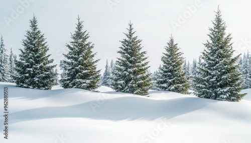 A serene winter landscape featuring snow-covered ground and evergreen trees under a soft, hazy sky.