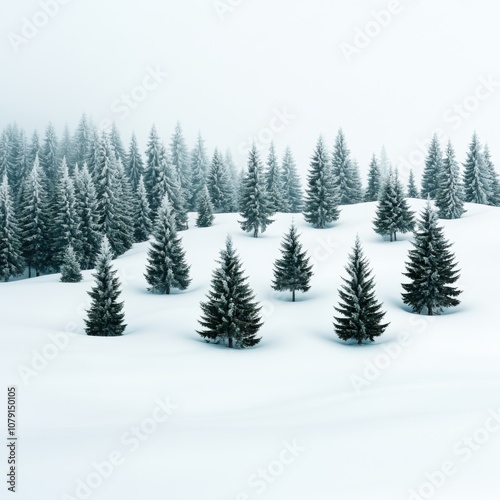 A serene winter landscape featuring snow-covered ground dotted with evergreen trees under a misty, soft sky.