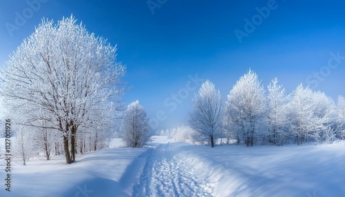 a serene winter landscape featuring white trees and a snowy path against a blue background