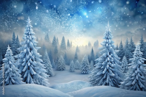 A serene winter landscape with snow-covered trees and soft flakes falling amidst the twilight glow in a tranquil forest setting. Generative AI