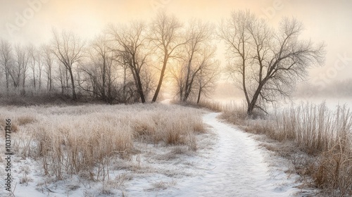 A serene winter landscape with trees, a path, and soft fog at sunrise.