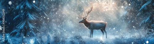 A serene winter scene featuring a majestic deer standing in a snowy forest, evoking a peaceful and magical atmosphere.