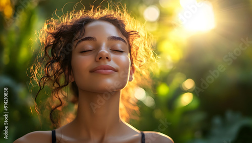 A serene woman enjoying nature, basking in soft sunlight with a peaceful expression, surrounded by lush greenery.