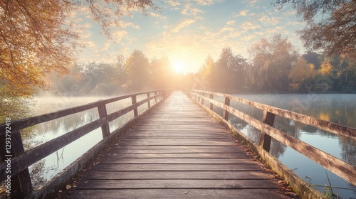 A serene wooden bridge spanning over a calm body of water, with the warm sunlight shining down, creating a peaceful and picturesque outdoor scene