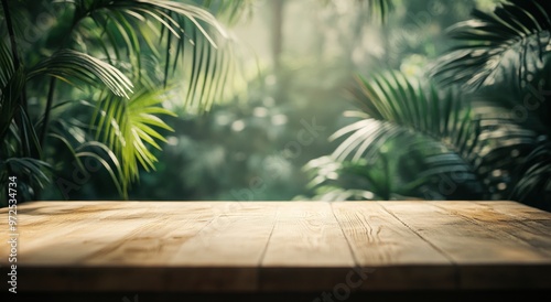A serene wooden table in a lush, green tropical setting, ideal for presentations or displays.