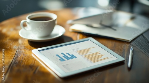 A serene workspace featuring a tablet displaying data analysis beside a coffee cup and notebook