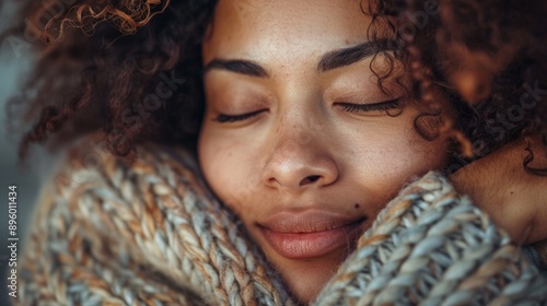 A serene young woman in gray, eyes closed, smiles contentedly, wrapped in a cozy blanket in a tranquil setting with warm colors.