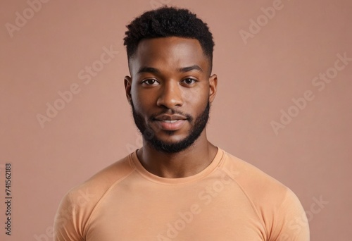 A serene-looking man in a fitted peach shirt, his calm expression set against a soothing background.
