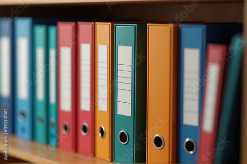 A series of colorful binders stands in neat order on a wooden shelf, reflecting an organized workspace. Each binder displays a blank spine for labeling, enhancing functionality and aesthetic