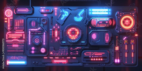 A series of digital interface elements, such as buttons, sliders, and icons, rendered in a futuristic style with neon accents