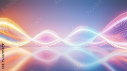 A series of glowing white lines create a wave formation on a soft pink and blue gradient backdrop. The white lines are mirrored in the reflection of the smooth surface below.