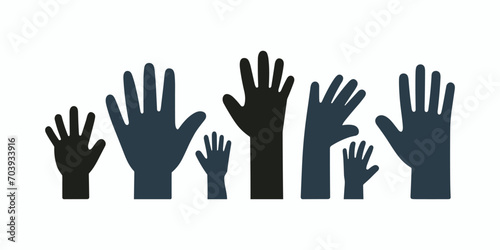 A series of silhouettes of hands of different sizes stretched upwards on a white background.