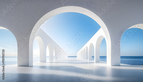 A series of white arches leading to a bright, ethereal horizon. The minimalist design creates a sense of openness and possibility.