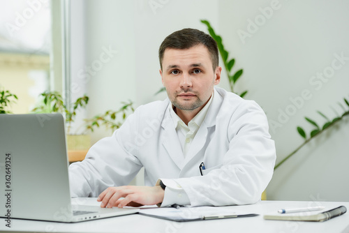 A serious caucasian doctor in a white lab coat was distracted while searching medical information on a laptop in a hospital. A therapist near a computer in a doctor's office.