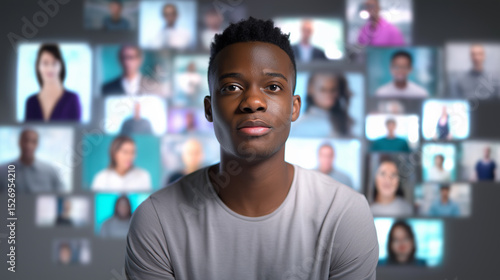 A serious young African American man stands prominently in front of a grid of diverse digital portraits, symbolizing online community or AI.