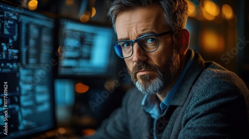 A serious-looking man in glasses sits in front of two computer monitors, working late at night.