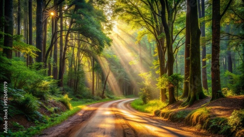 A serpentine dirt road winds its way through a lush, vibrant forest, surrounded by towering trees and illuminated by dappled sunlight filtering through the canopy.