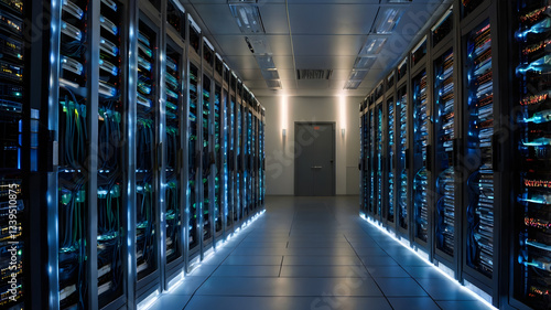 A server room filled with rows of glowing hard drives and cables, representing high-tech infrastructure