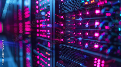 a server room with a lot of computer servers. The servers are lit up in pink and blue lights.