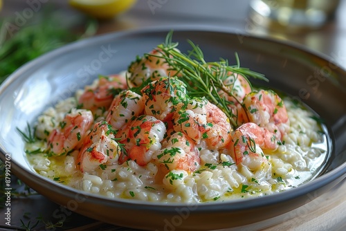 A serving of creamy lobster risotto, garnished with fresh herbs and a drizzle of lemon oil.