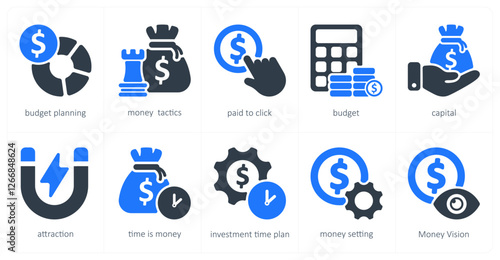 A set of 10 business icons as budget planning, money tactics, paid to click
