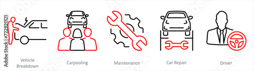 A set of 5 Car icons as vehicle breakdown, carpooling, maintenance