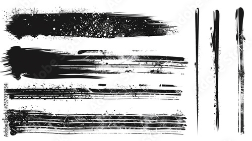 A set of black brush strokes and paint splatters on a white background, showcasing a variety of textures and forms.