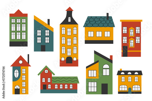 A set of colorful flat style houses. Buildings with Scandinavian style windows. Fancy town and country houses with windows, roof tiles and chimneys with smoke. Cute country tiny houses.