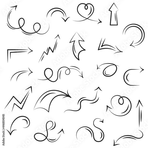 A set of decorative guide arrows up and down, circular and straight. Collection of icon on the white background. Doodle style. Black outline