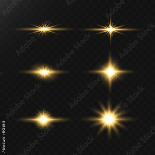 A set of flares, bright lights and sparkles on a black background. Golden flashes and glare. Abstract golden isolated lights Bright rays of light. Glowing lines.