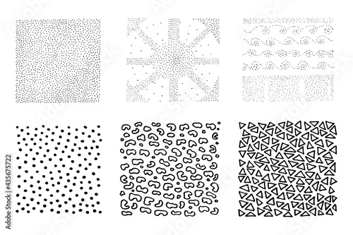 A set of geometric shape backgrounds: dots, circles, triangles. A background of large and small black dots on a white background. Vector image. Hand drawing