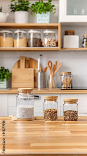 A set of glass jars with different types and sizes of grain on a table in front, against a kitchen background.