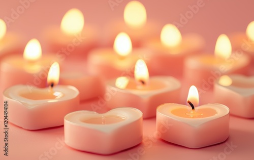A set of heart-shaped tealight candles glowing on a soft pastel coral background for valentines day