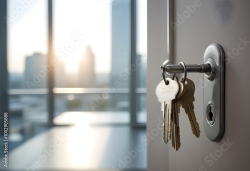 A set of house keys hanging on a door handle in an office setting, with a blurred background of a window and cityscape