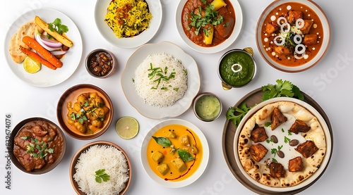 A set of Indian food dishes on a white background, in a top view, flat lay, photo stock