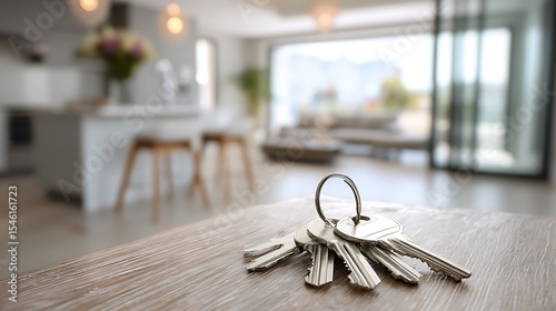 A set of keys on a table in a modern home interior, with an open kitchen, living room, sofa, and window in the background. .