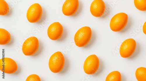 A set of kumquats arranged in a minimalist geometric pattern on a textured white background, emphasizing their vibrant orange color