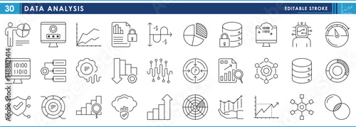 A set of line icons related to Data Analysis. Data, digital, graph, analyze, surplus, growth, research, loss, business, security, and so on. Vector editable stroke.