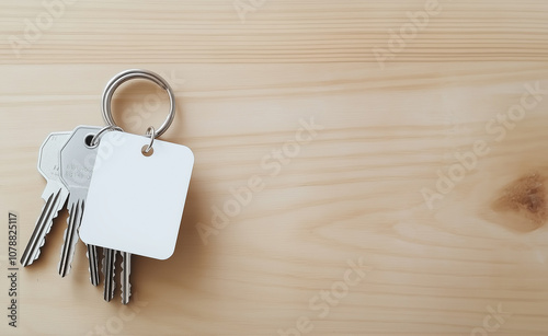 A set of metal keys with a blank white key tag on a wooden surface, suggesting property or security themes.